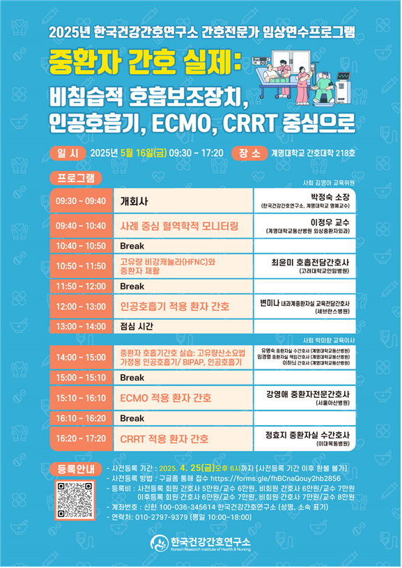 한국건강간호연구소에서 ‘중환자 간호 실제: 비침습적 호흡보조장치, 인공호흡기, ECMO, CRRT 중심으로’를 주제로 2025년 간호전문가 임상연수를 다음과 같이 개최합니다.