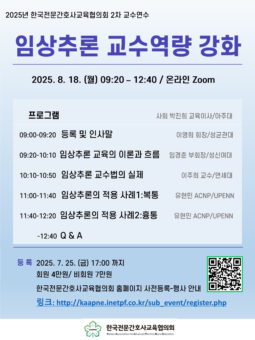 협의회에서는 오는 8월 18일 「임상추론 교수역량 강화」를 주제로 다음과 같이 전문간호사 교육과정 교수 연수를 진행하고자 하오니, 관심있는 회원분들의 적극적인 참여 부탁드립니다.