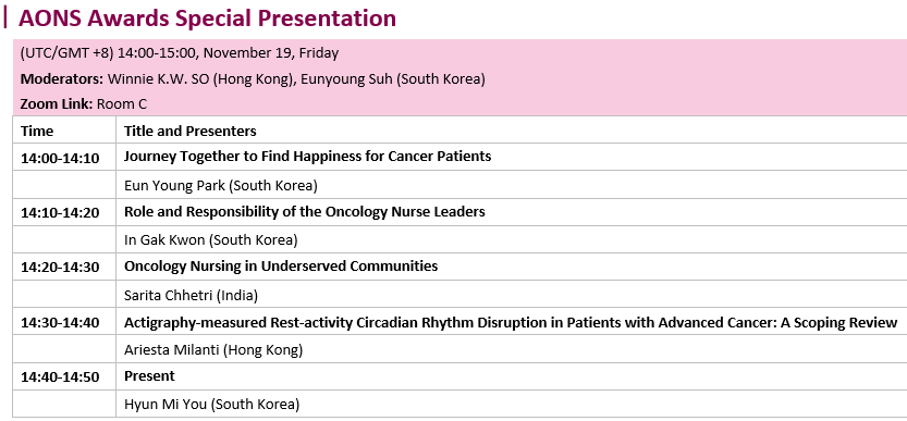 2021 AONS(Asian Oncology Nursing Society)는 아시아 종양학 간호 전문가들에게 우수상과 교육 장학금을 지급해 개인적이고 전문적인 우수성을 추구할 수 있도록 지원하는 데 전념하고 있습니다.