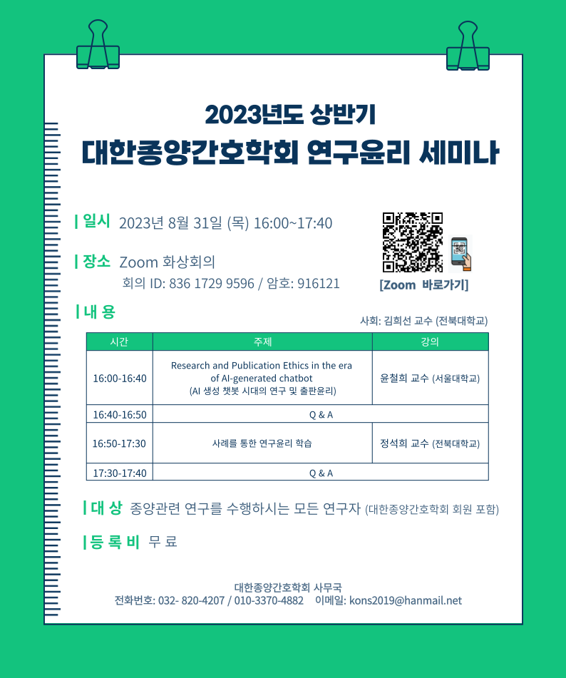 학회에서는 종양관련 연구를 수행함에 있어서 요구되는 연구윤리에 대한 지식을 향상시키고자, [2023년 상반기 대한종양간호학회 연구윤리 세미나]를 개최하게 되었습니다.