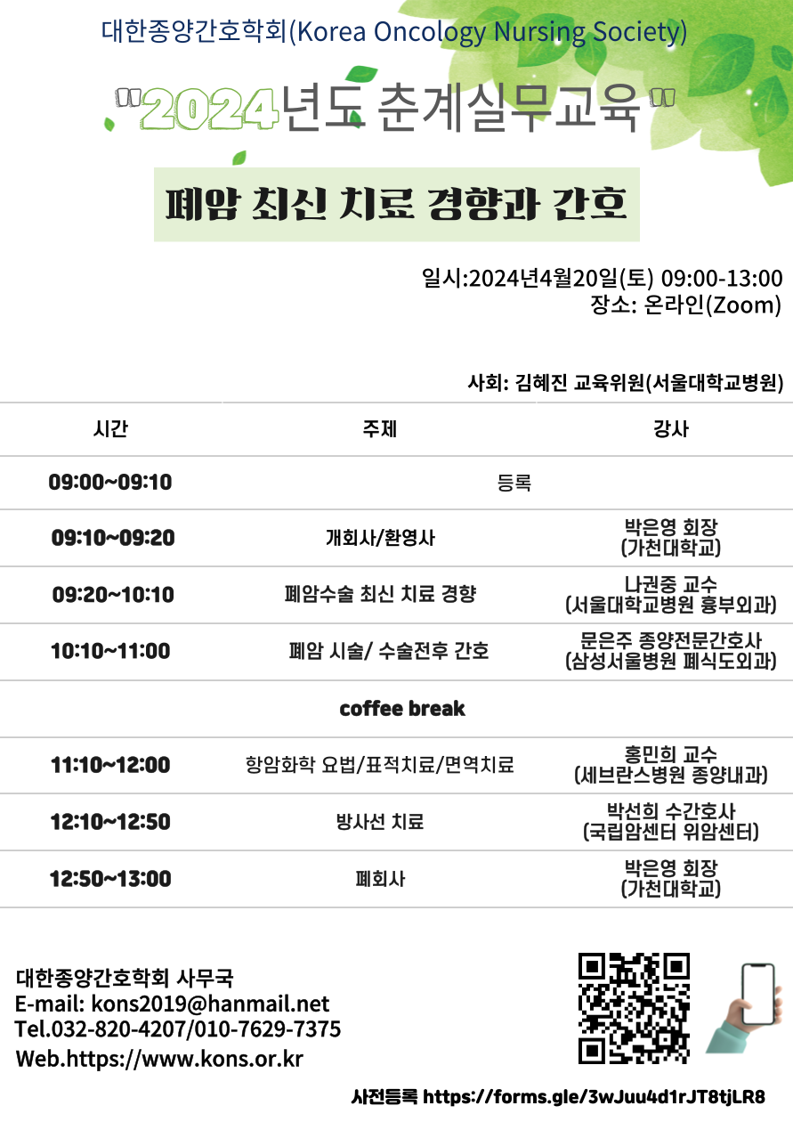 그 네번째로 2024년 4월 20일(토)에 "폐암 최신 치료 경향과 간호"에 대한 교육을 개최합니다.
